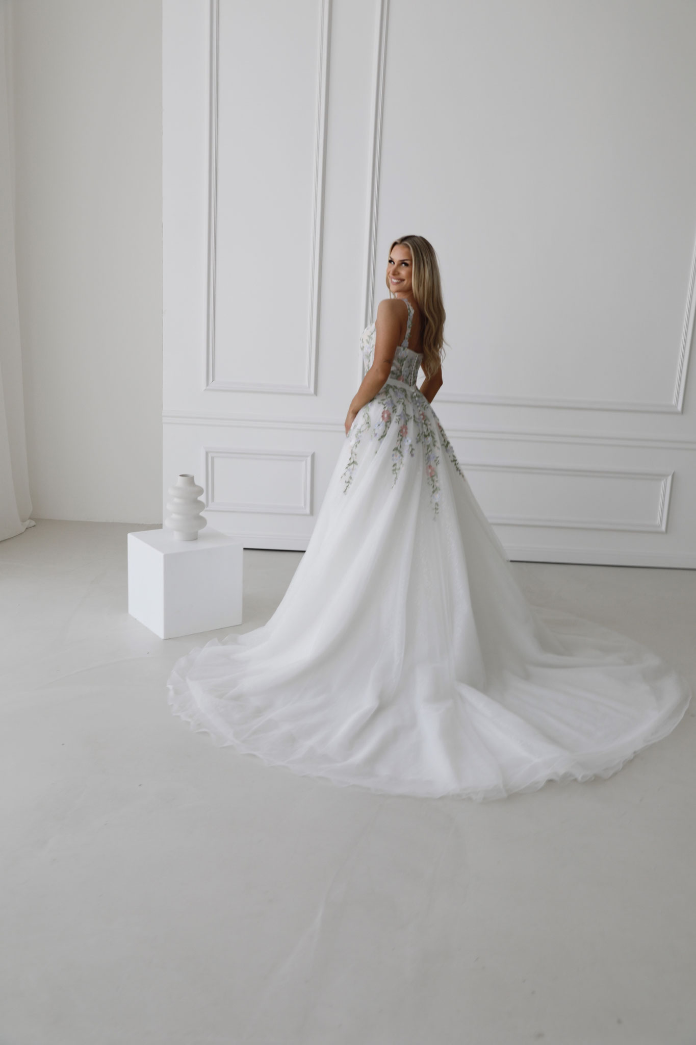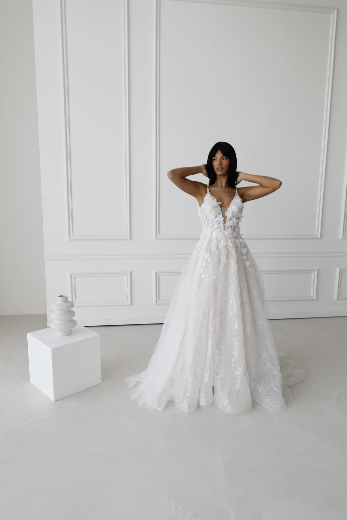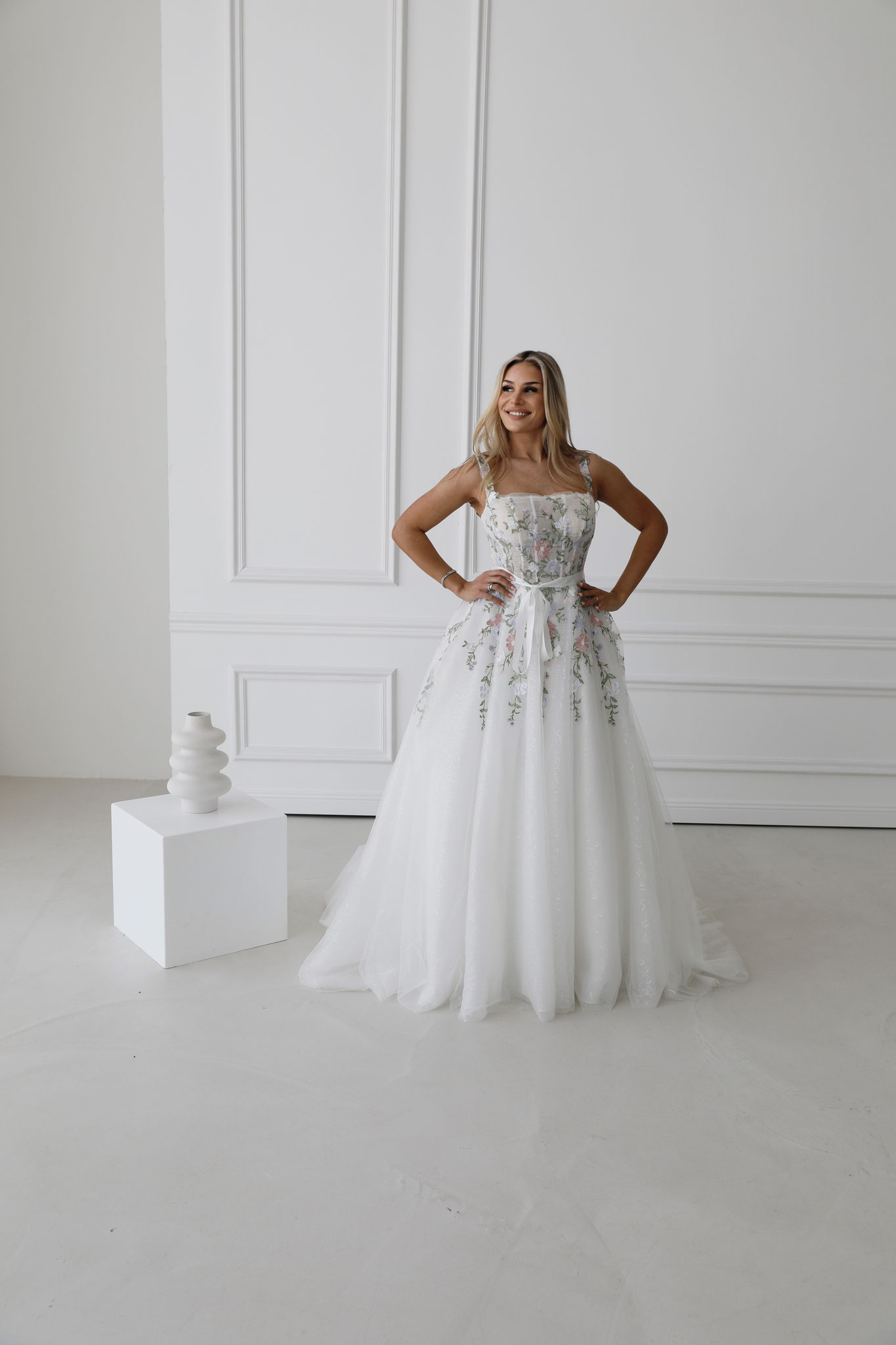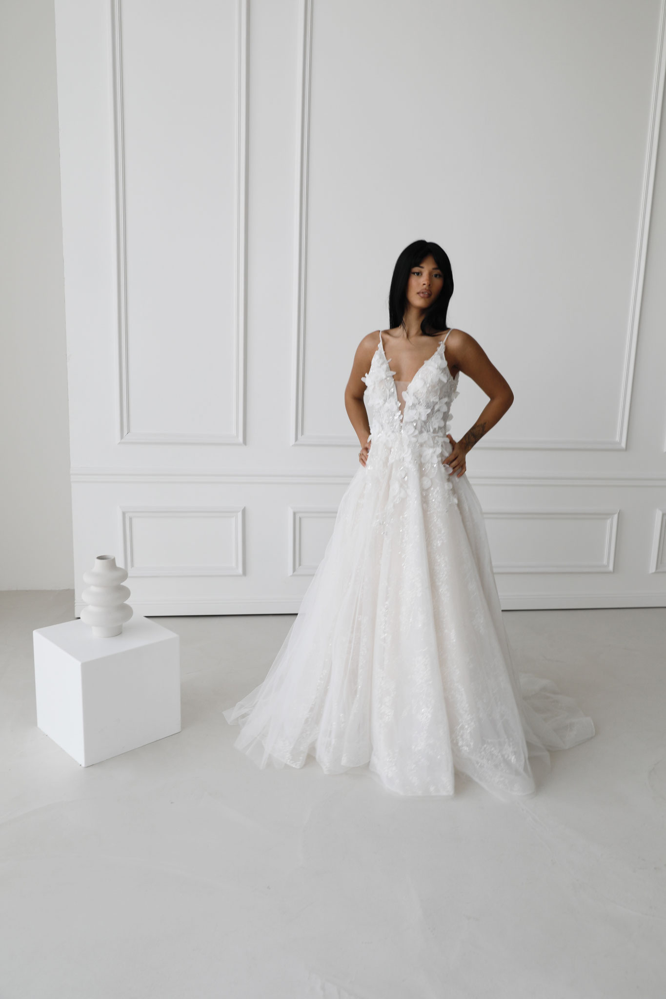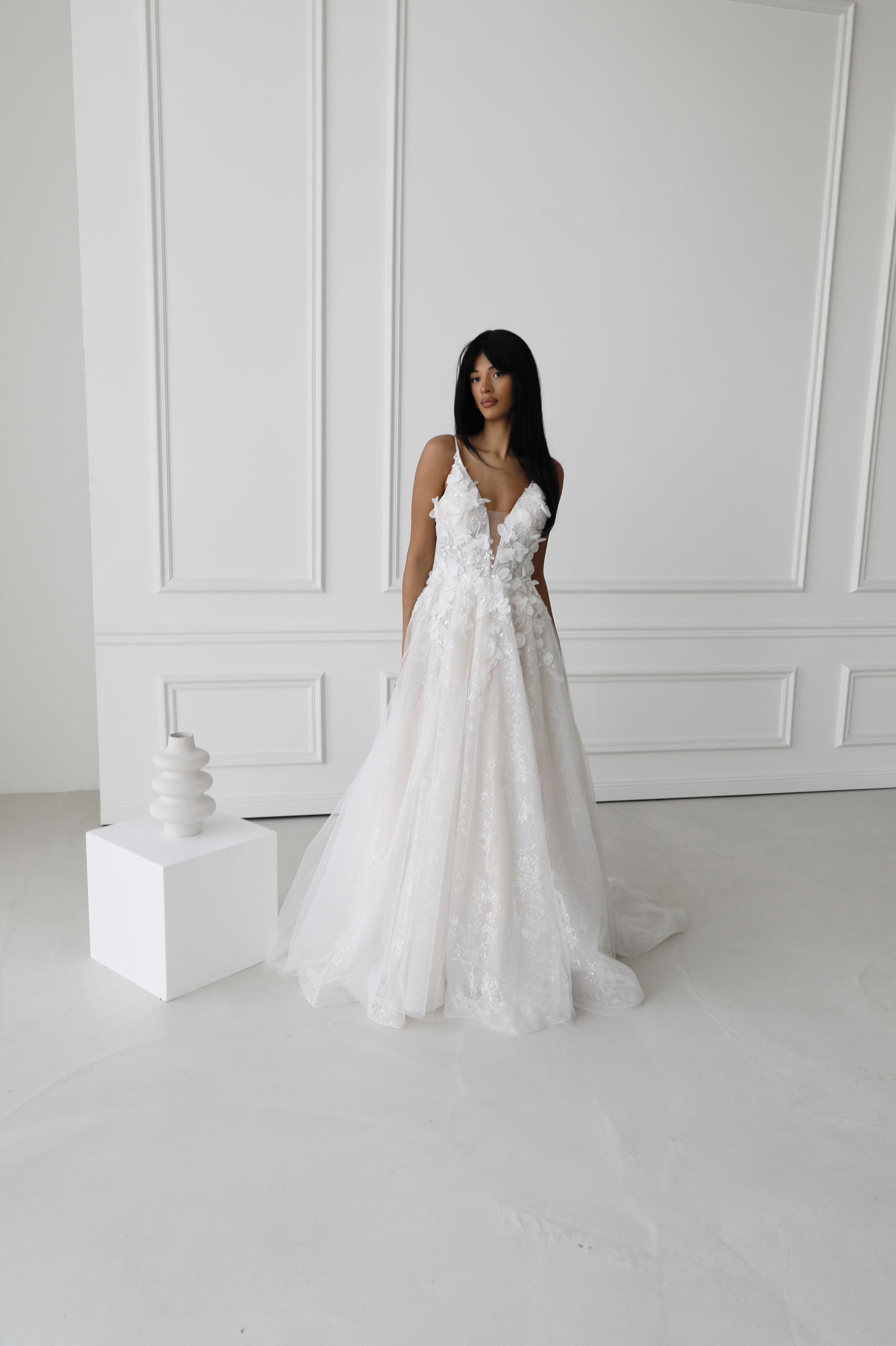 Unsere mit Blumen und floraler Spitze verzierten Brautkleider sind eine Hommage an die Schönheit der Natur. Zarte Blumenmuster und aufwendige Spitzenapplikationen verleihen jedem Kleid eine romantische Note und machen es perfekt für die Braut, die ihren besonderen Tag mit einem Hauch von Frische und Weiblichkeit feiern möchte.