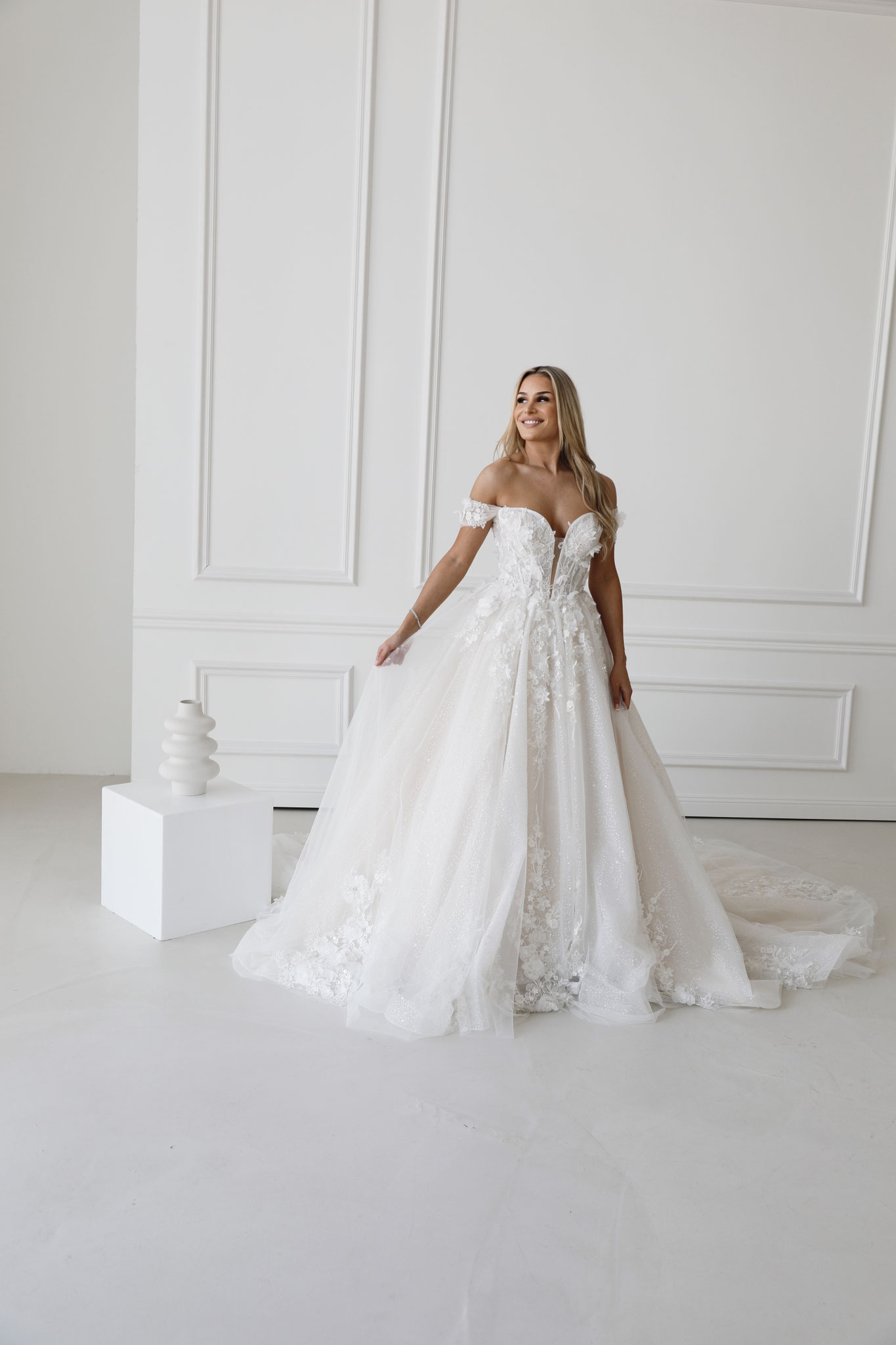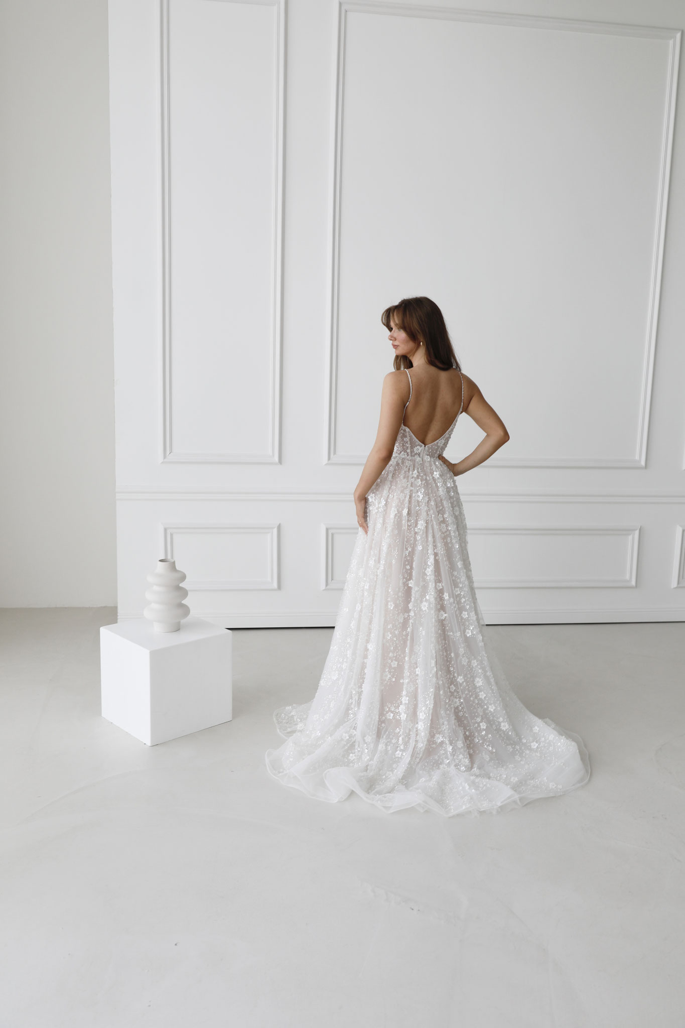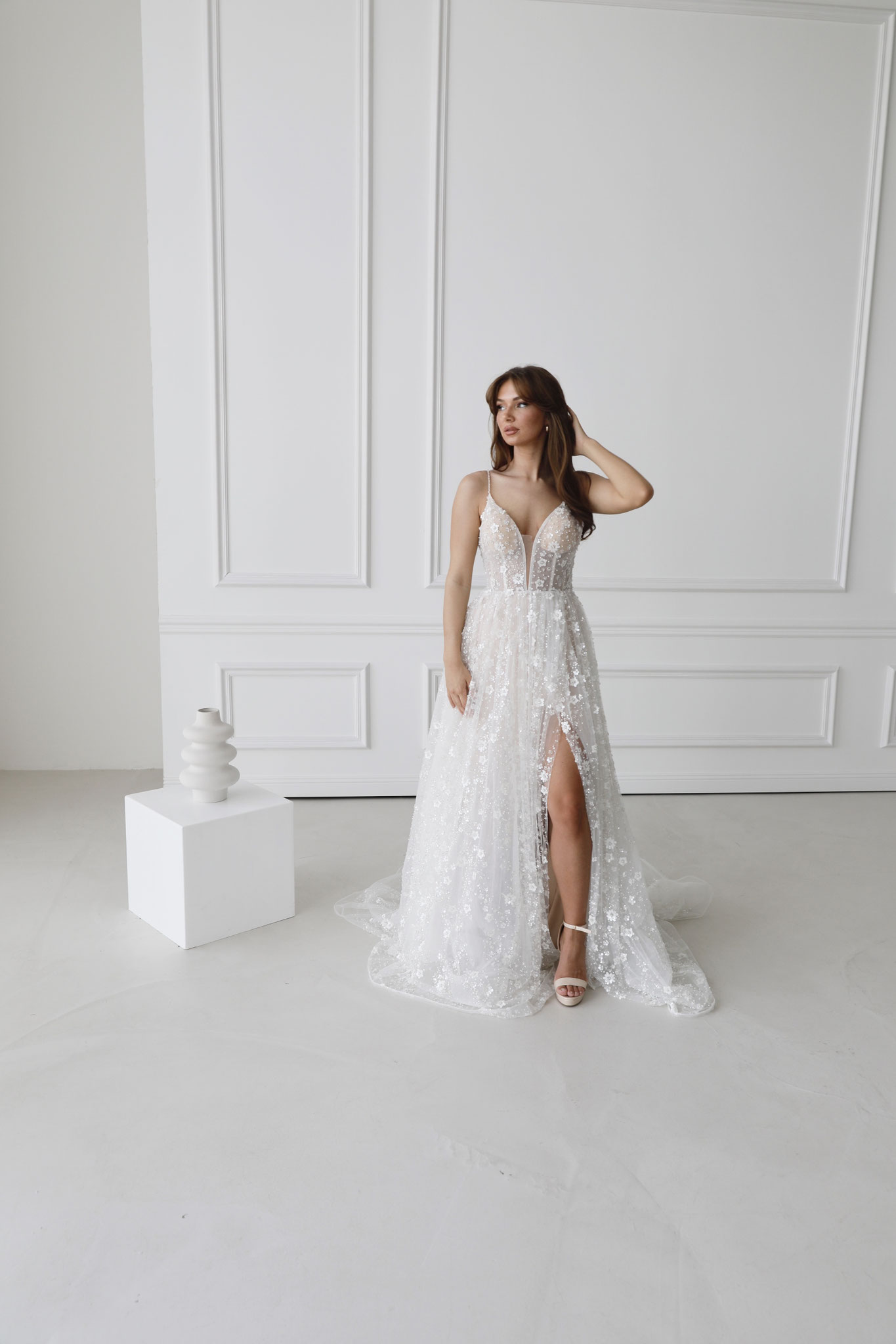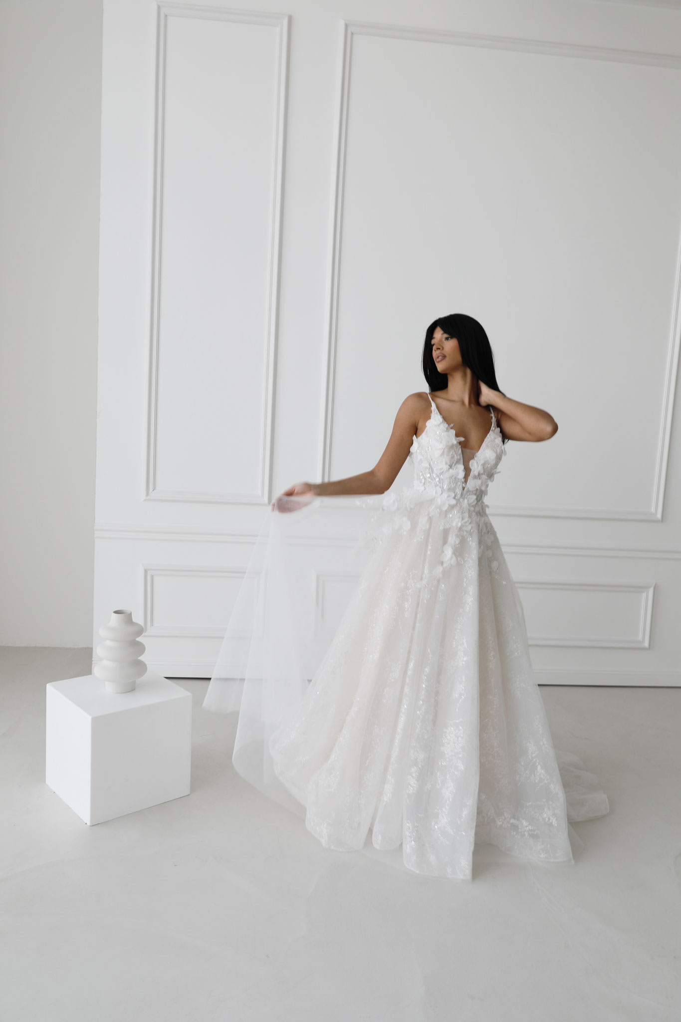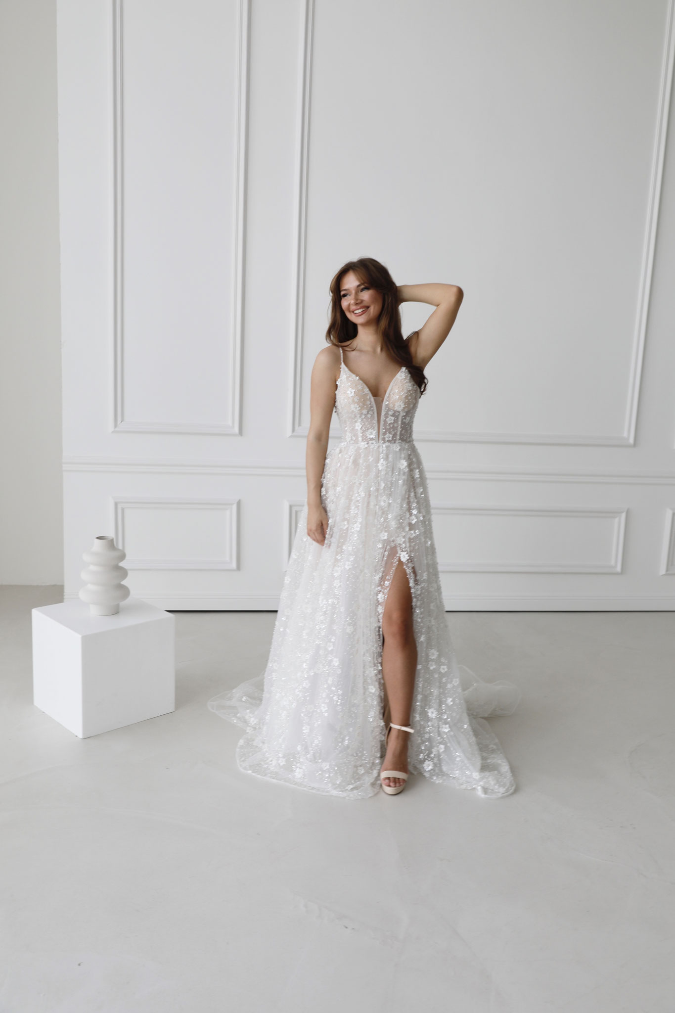Unsere mit Blumen und floraler Spitze verzierten Brautkleider sind eine Hommage an die Schönheit der Natur. Zarte Blumenmuster und aufwendige Spitzenapplikationen verleihen jedem Kleid eine romantische Note und machen es perfekt für die Braut, die ihren besonderen Tag mit einem Hauch von Frische und Weiblichkeit feiern möchte.