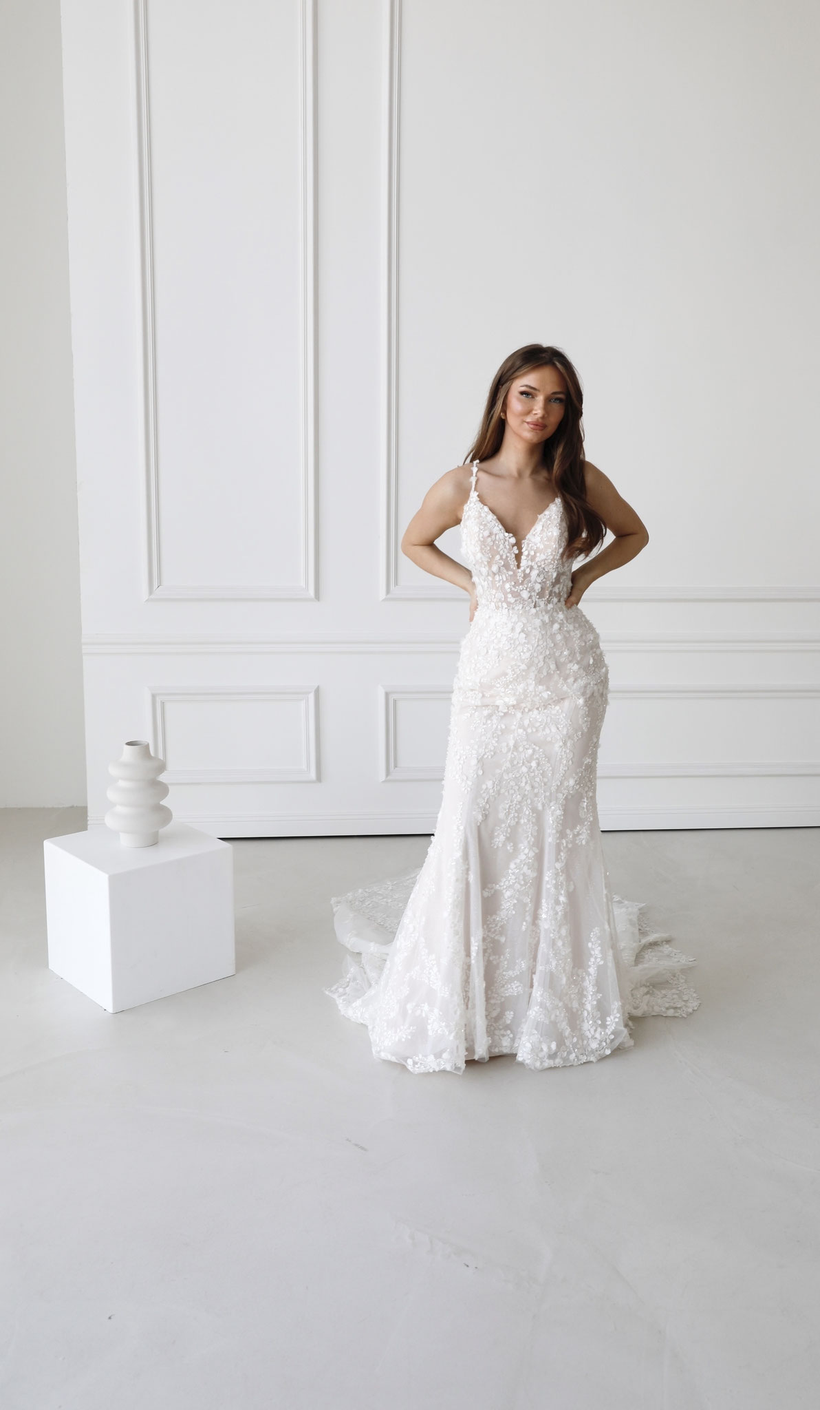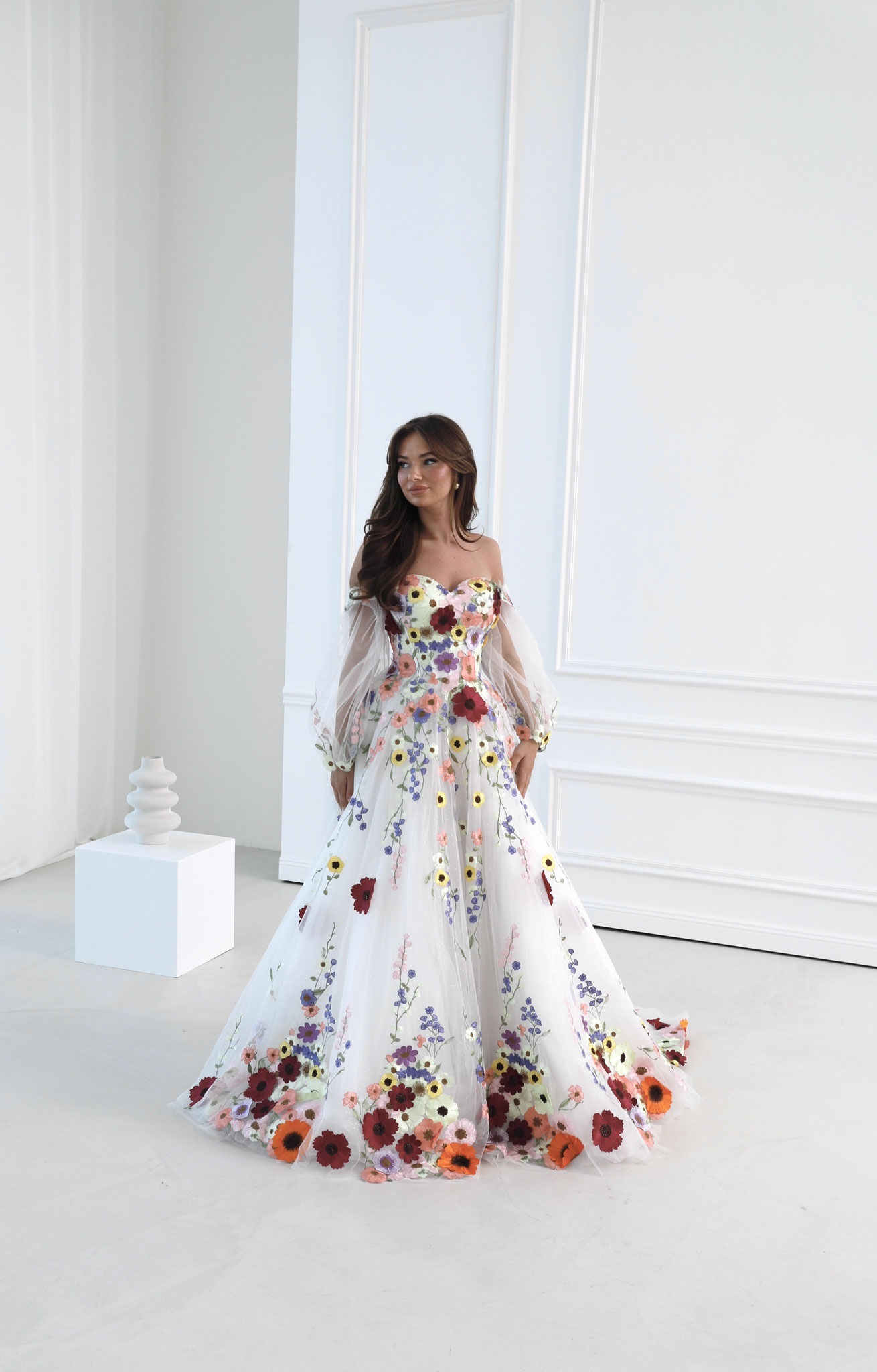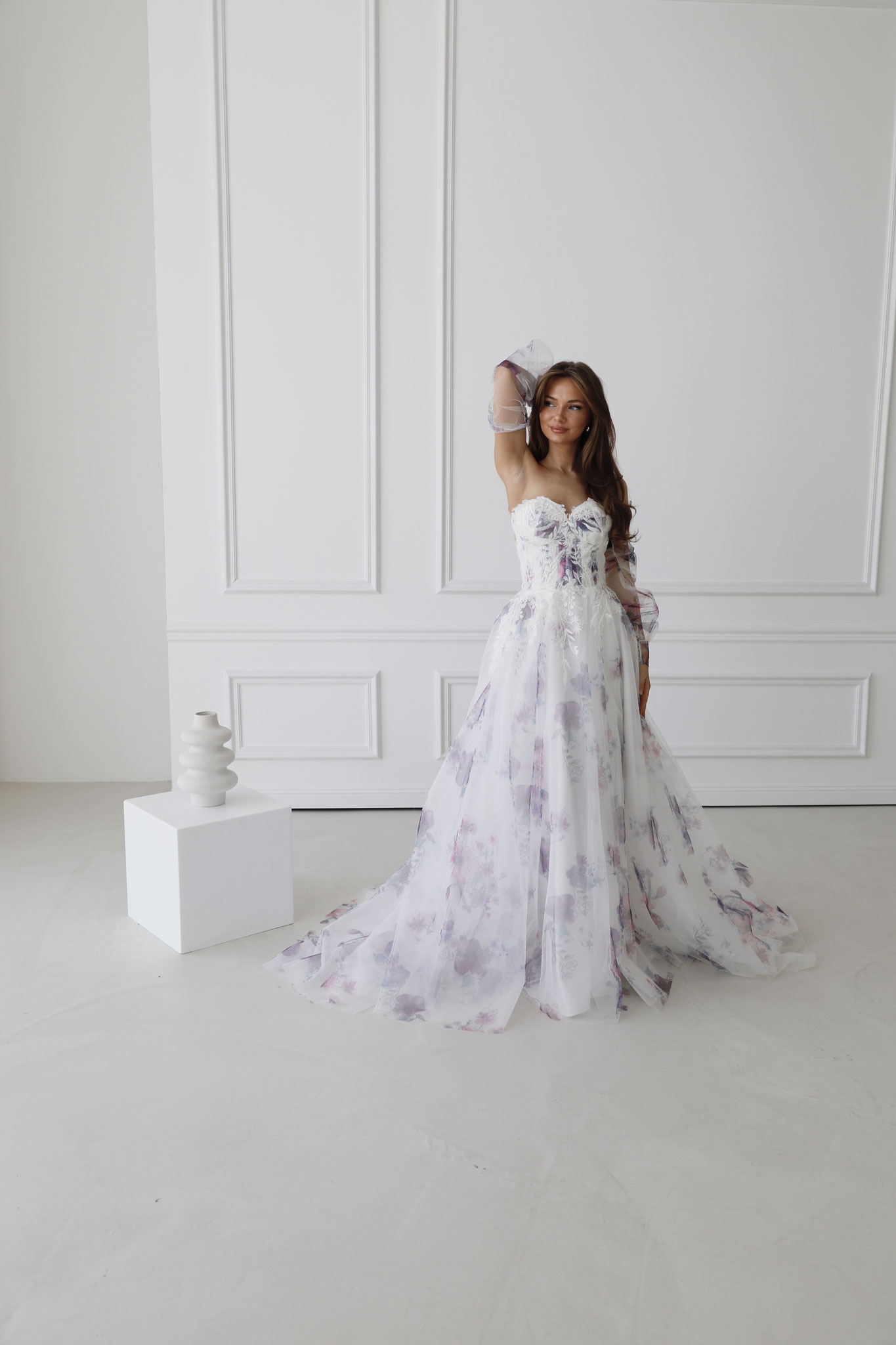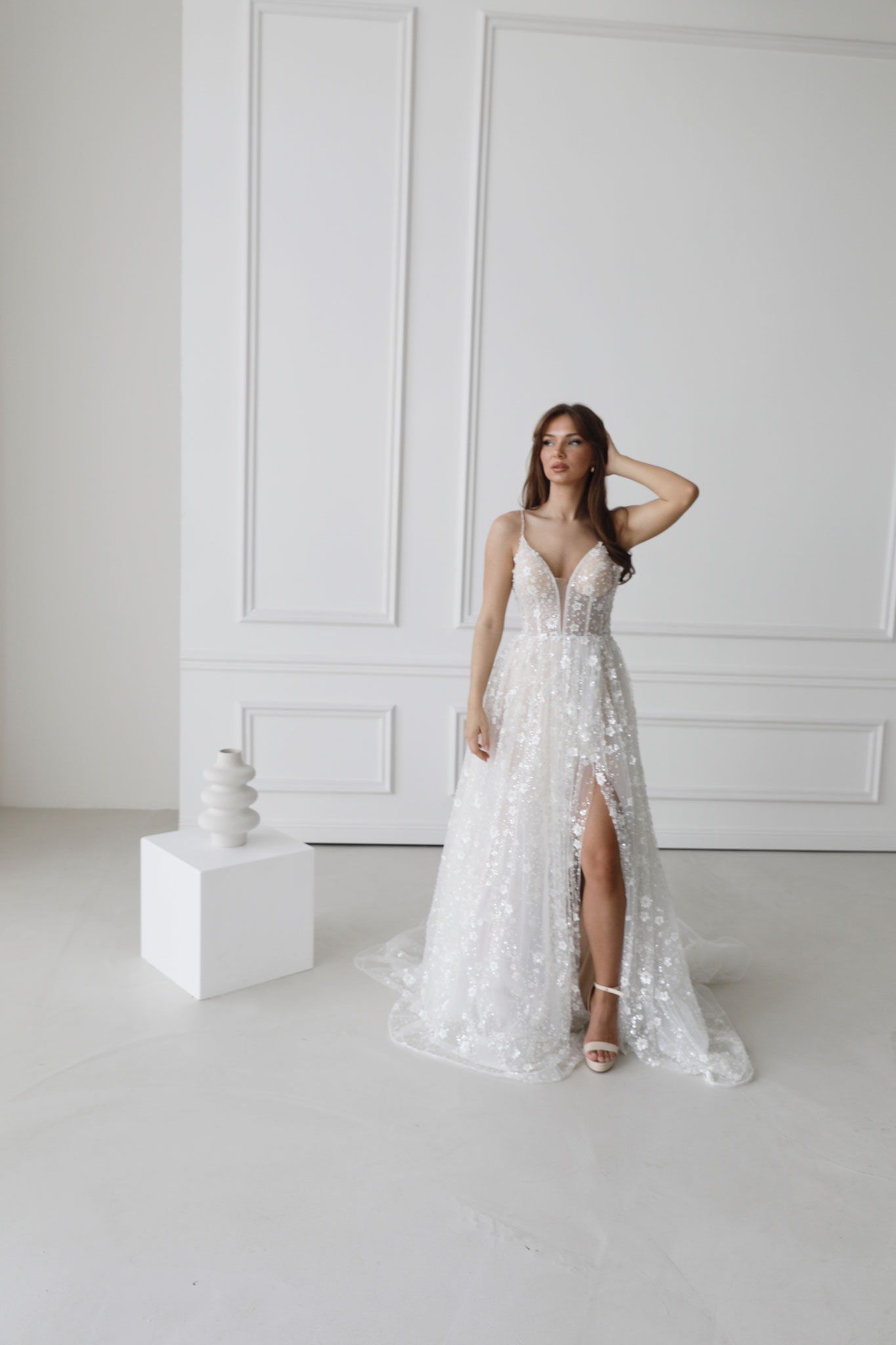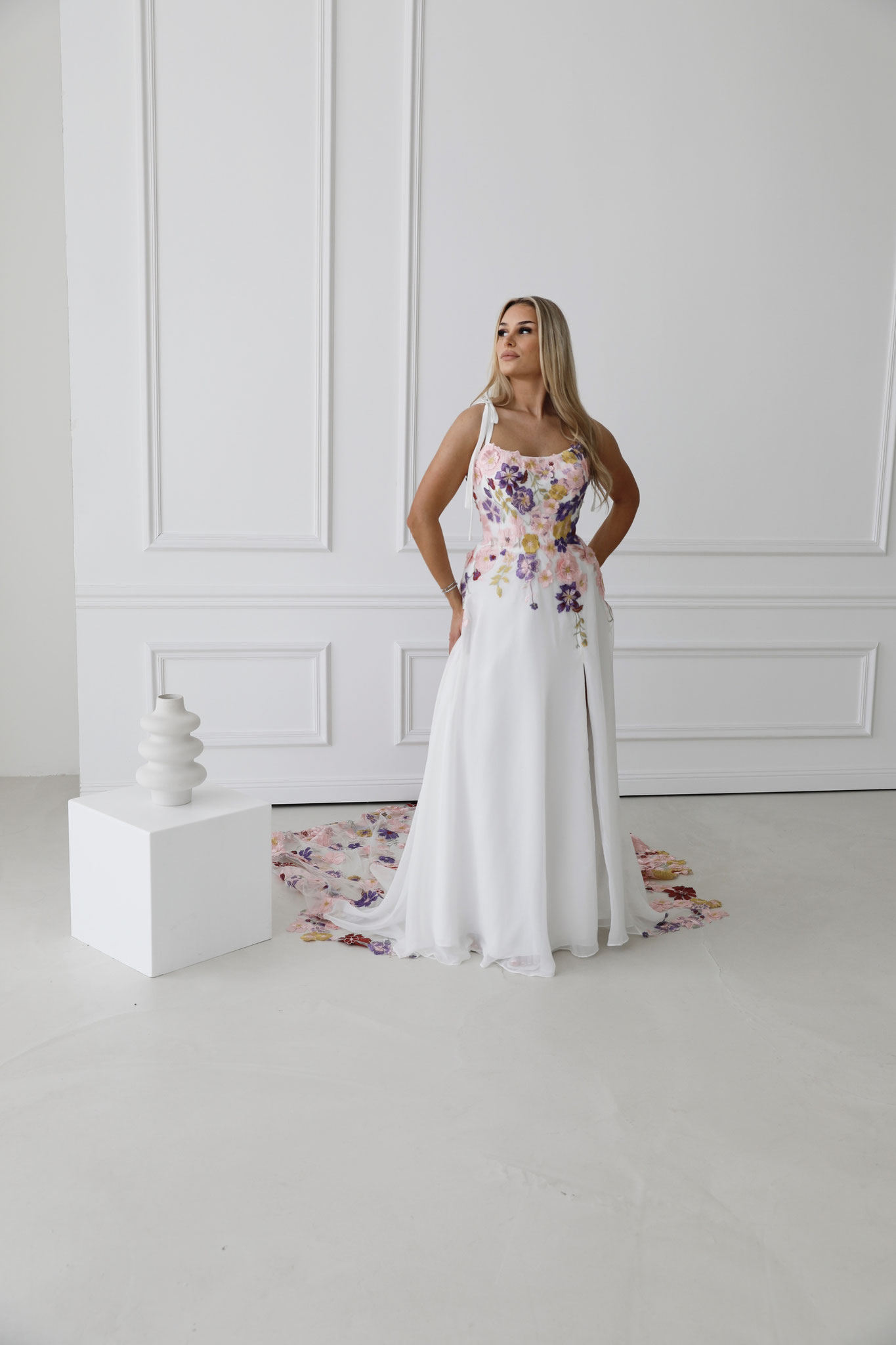 Unsere mit Blumen und floraler Spitze verzierten Brautkleider sind eine Hommage an die Schönheit der Natur. Zarte Blumenmuster und aufwendige Spitzenapplikationen verleihen jedem Kleid eine romantische Note und machen es perfekt für die Braut, die ihren besonderen Tag mit einem Hauch von Frische und Weiblichkeit feiern möchte.