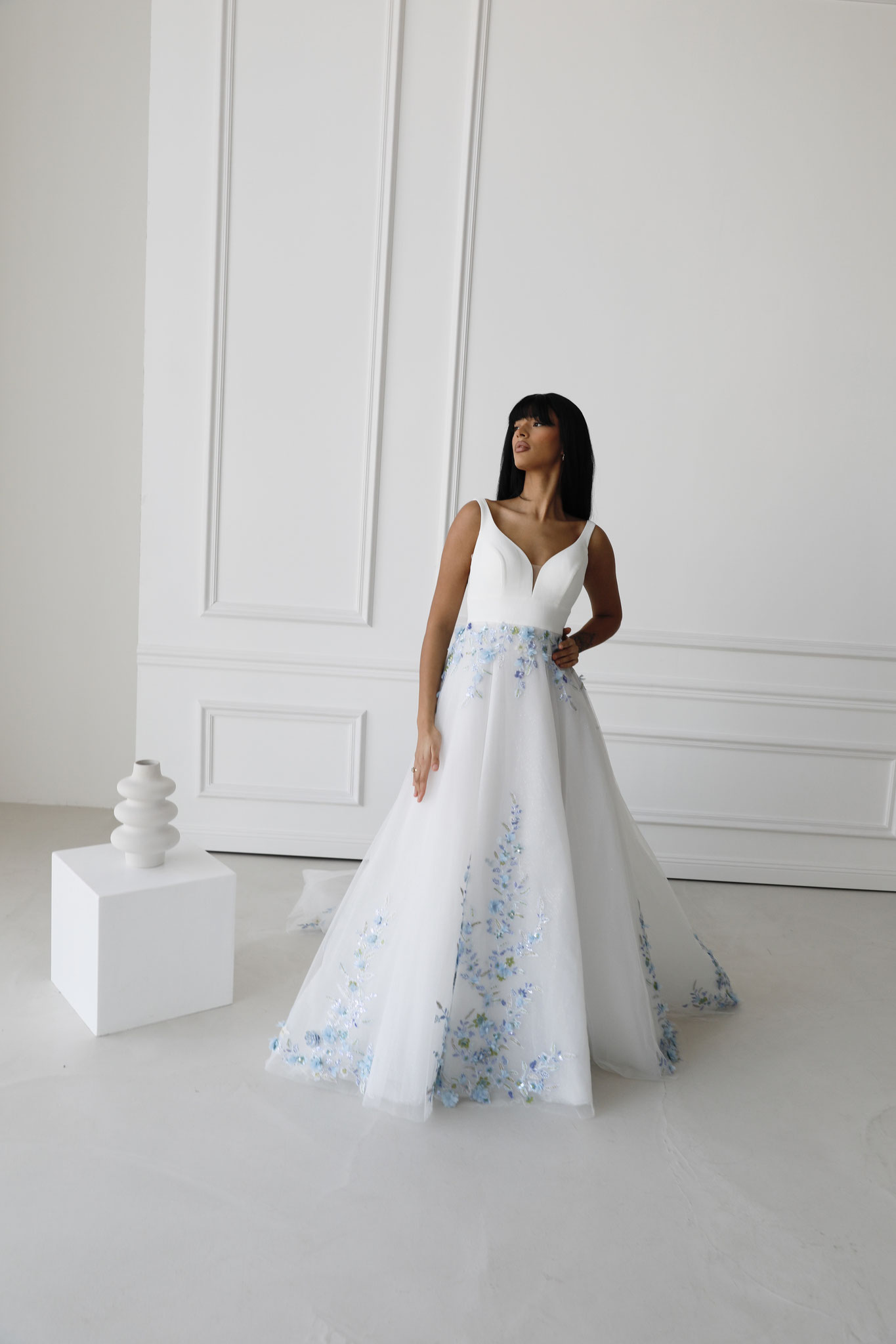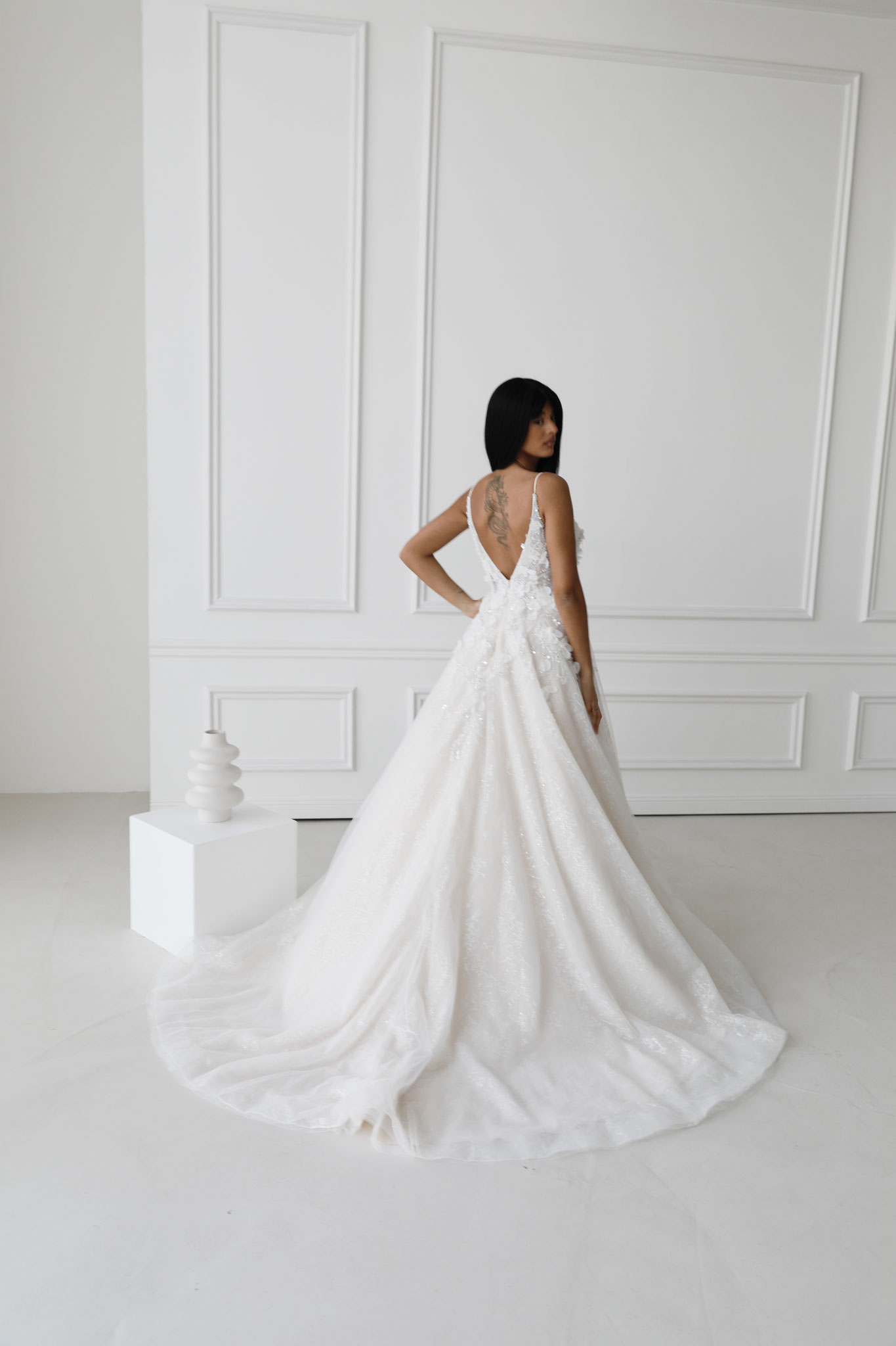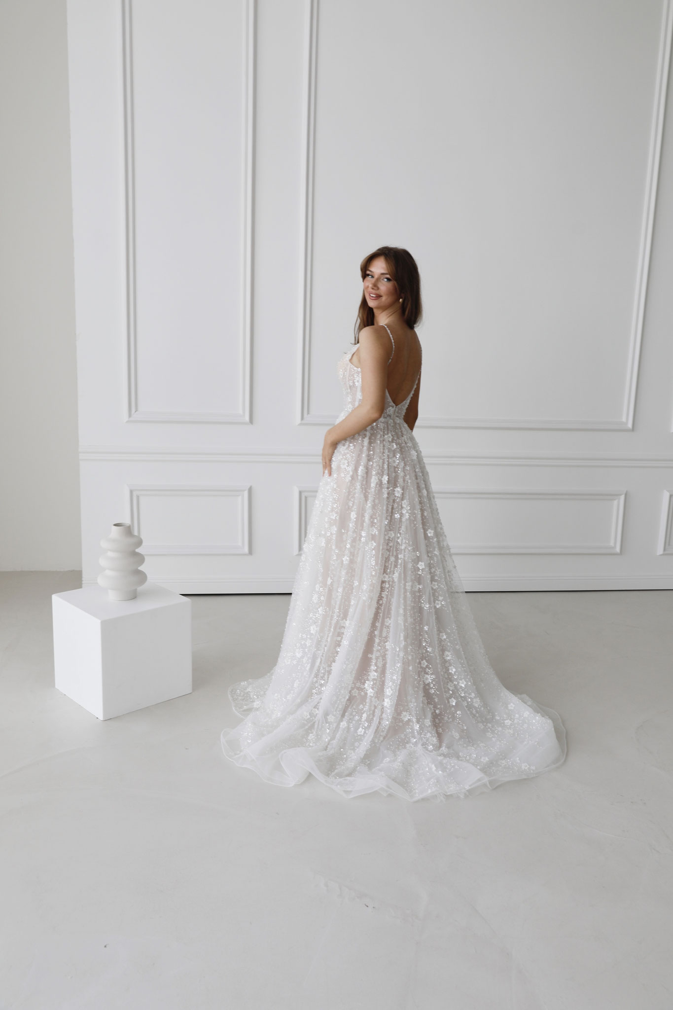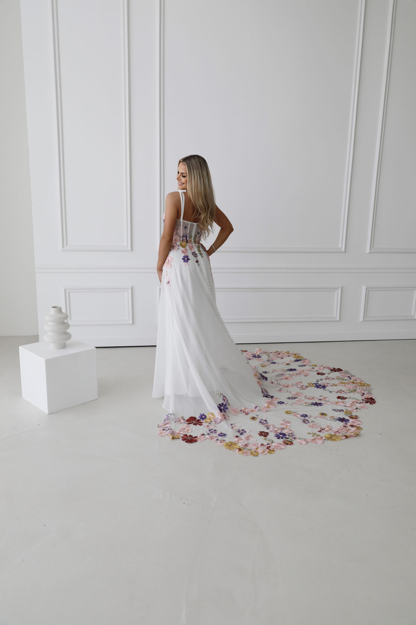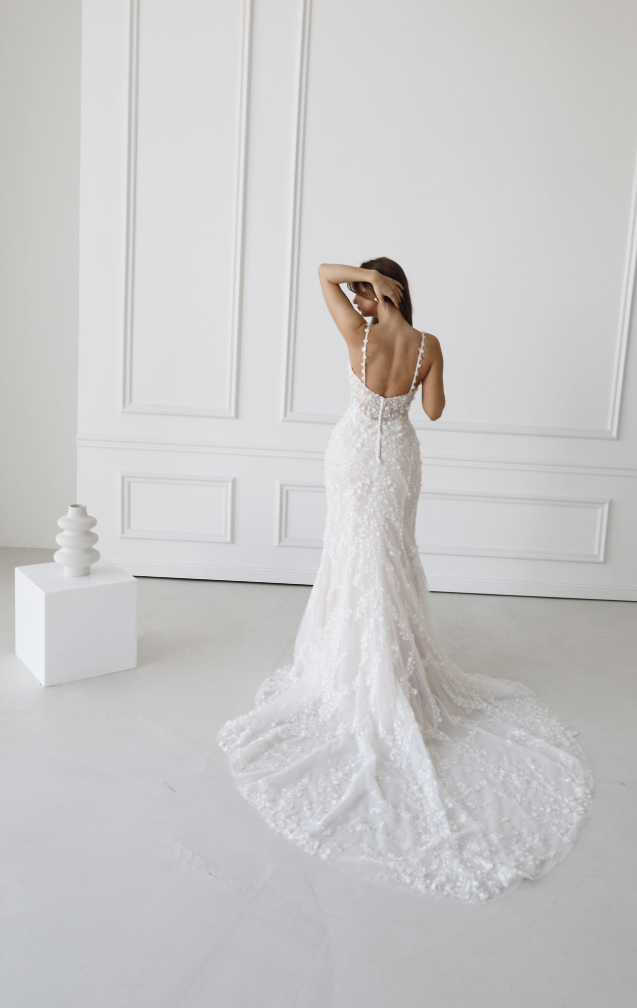 Unsere mit Blumen und floraler Spitze verzierten Brautkleider sind eine Hommage an die Schönheit der Natur. Zarte Blumenmuster und aufwendige Spitzenapplikationen verleihen jedem Kleid eine romantische Note und machen es perfekt für die Braut, die ihren besonderen Tag mit einem Hauch von Frische und Weiblichkeit feiern möchte.