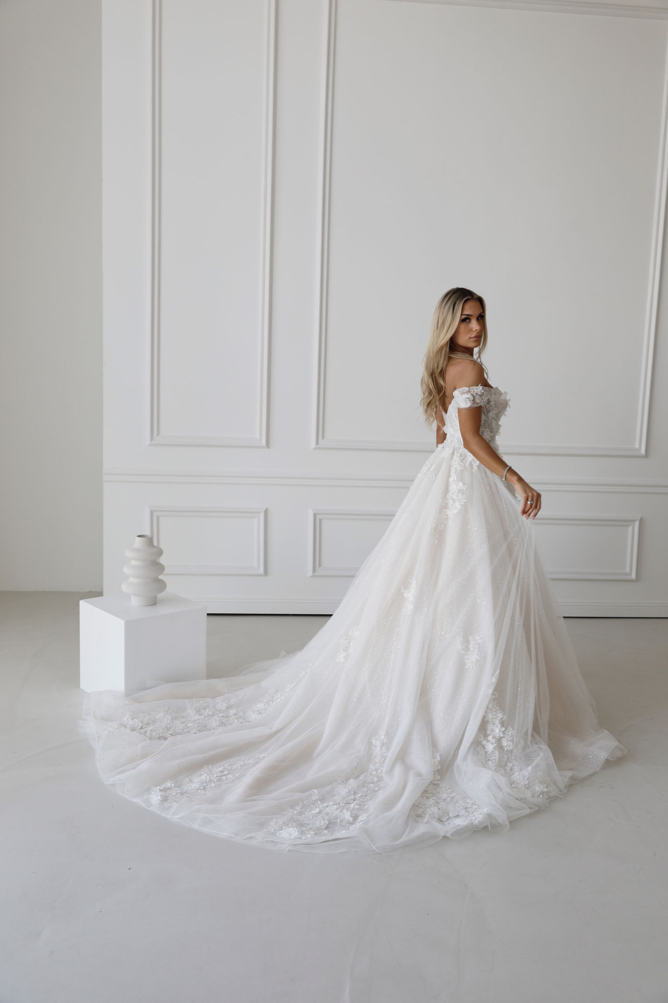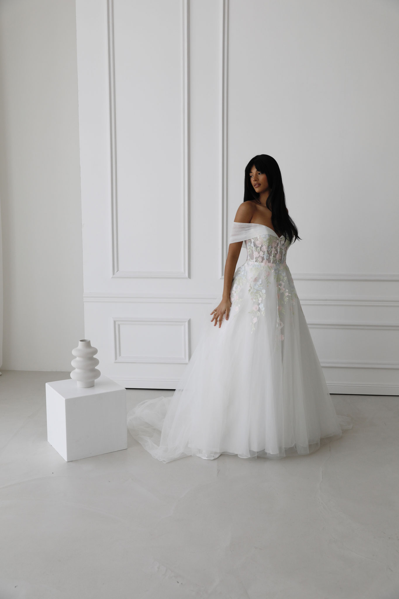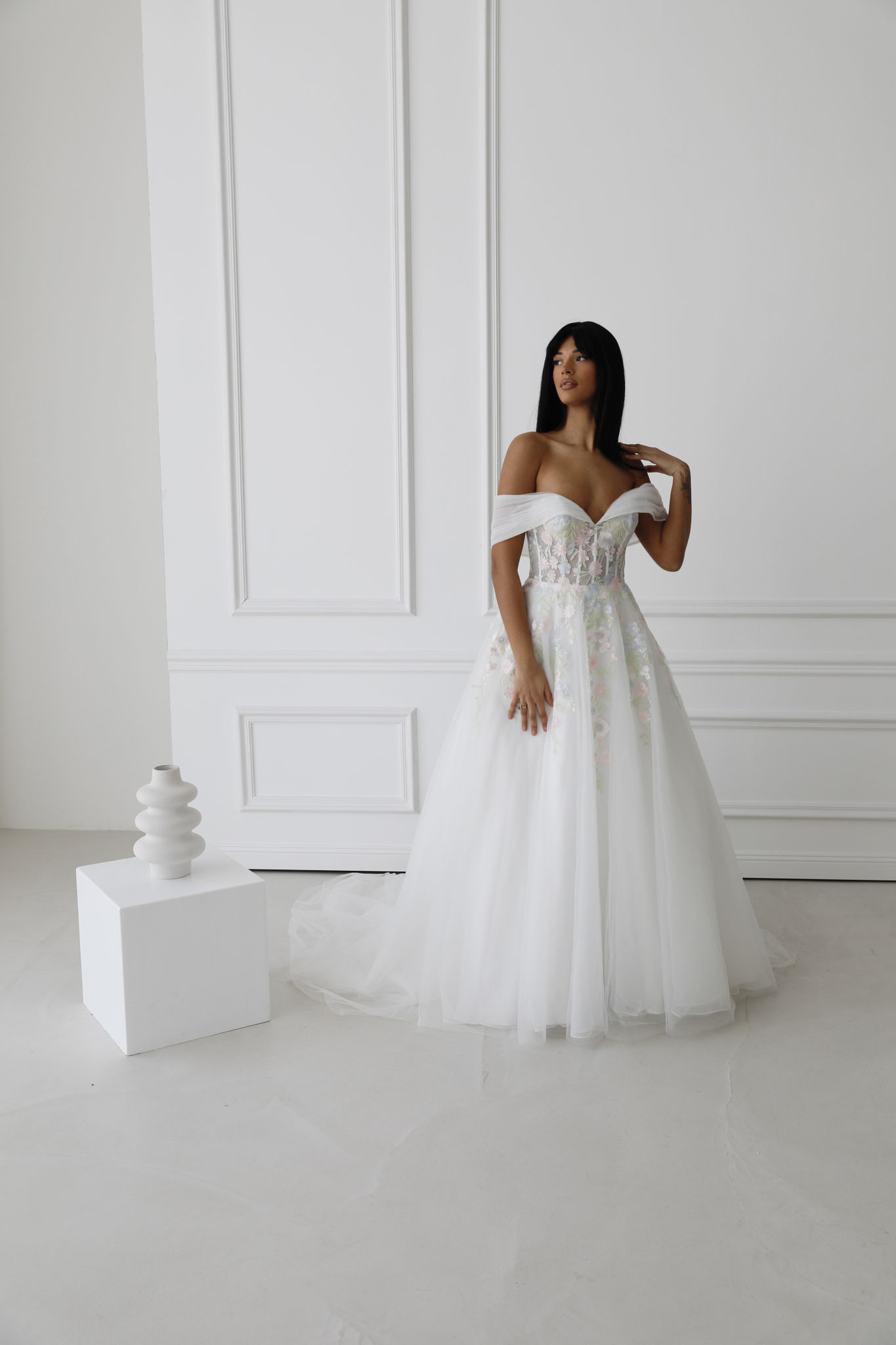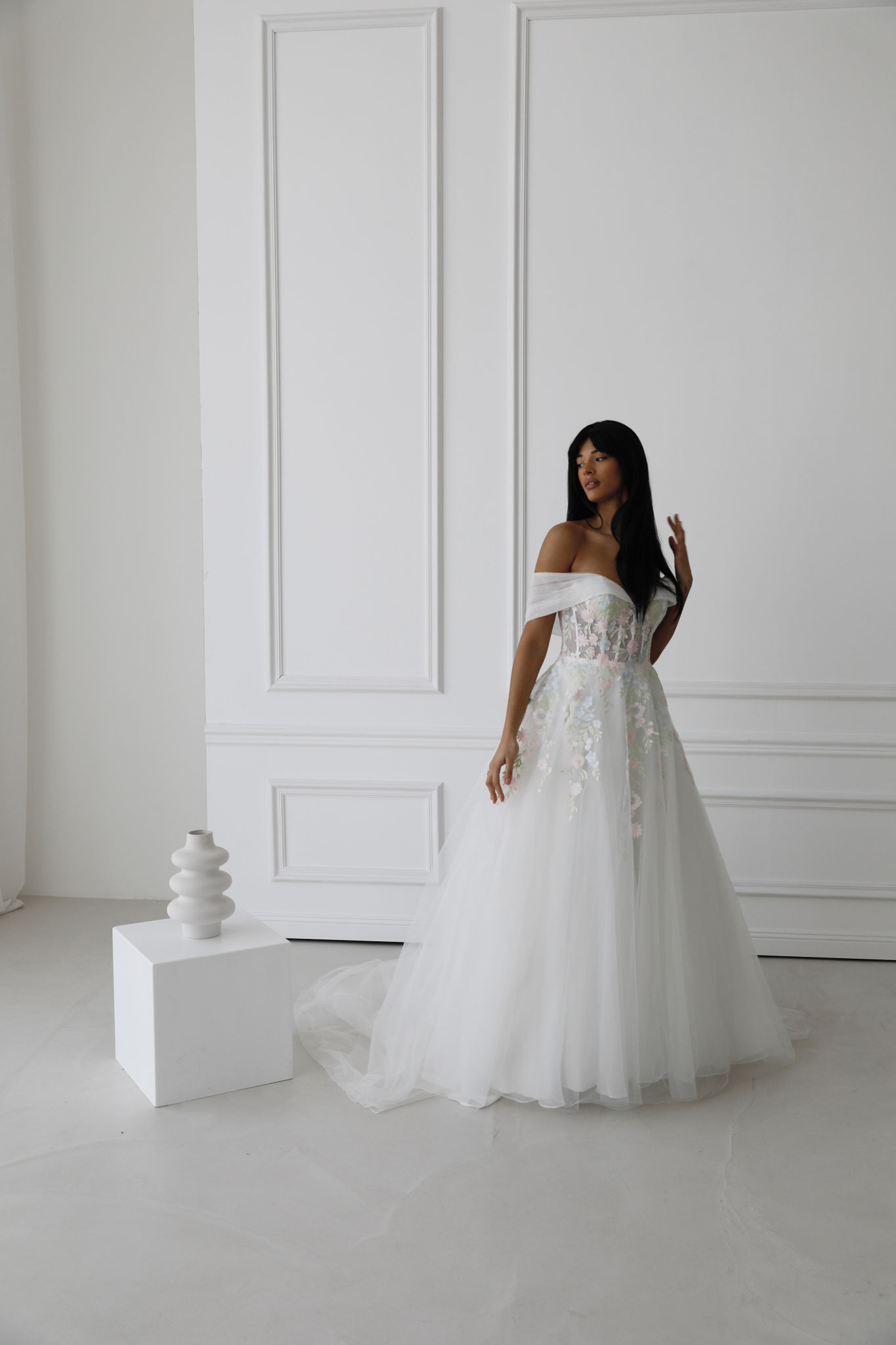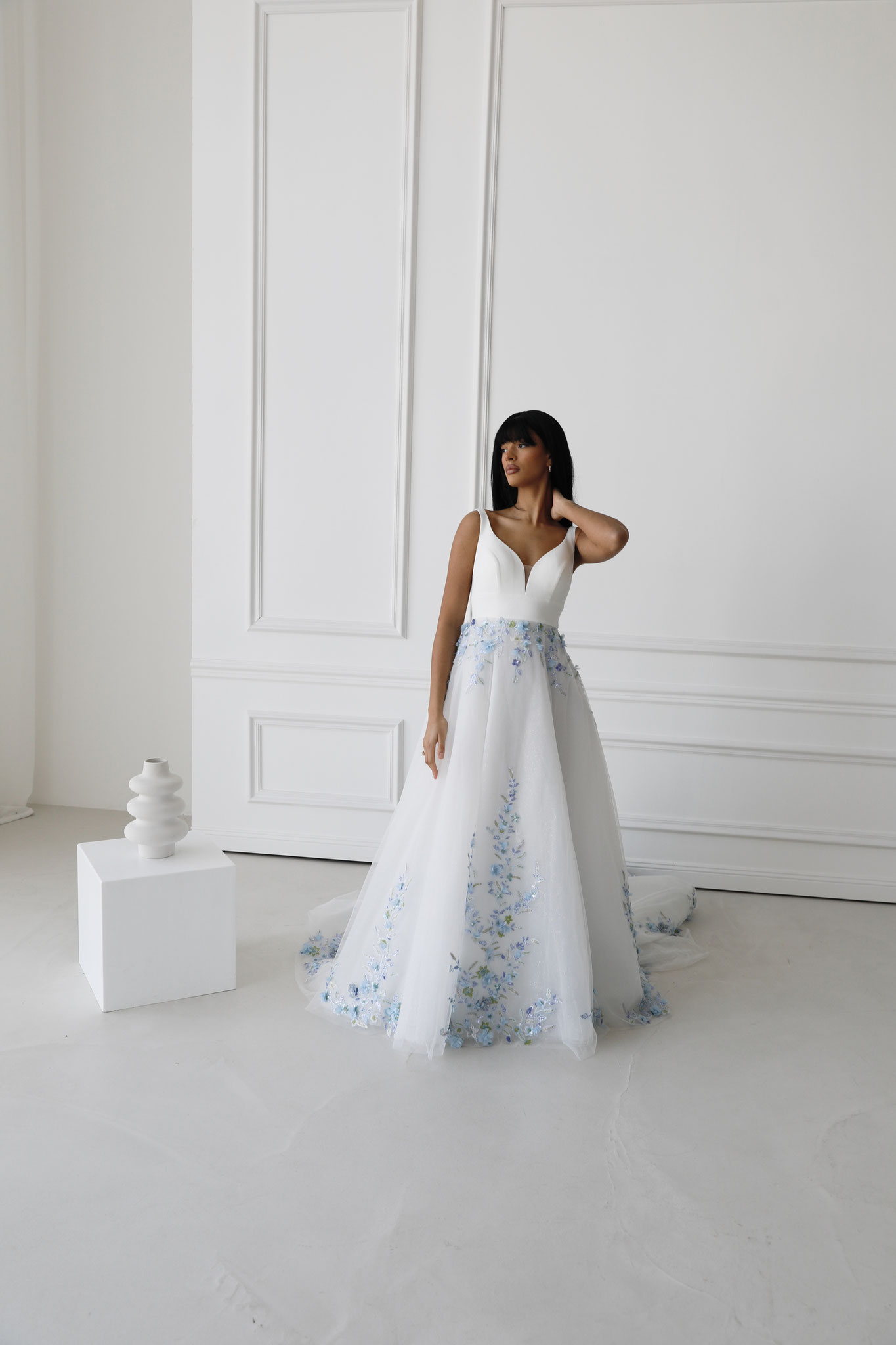 Unsere mit Blumen und floraler Spitze verzierten Brautkleider sind eine Hommage an die Schönheit der Natur. Zarte Blumenmuster und aufwendige Spitzenapplikationen verleihen jedem Kleid eine romantische Note und machen es perfekt für die Braut, die ihren besonderen Tag mit einem Hauch von Frische und Weiblichkeit feiern möchte.