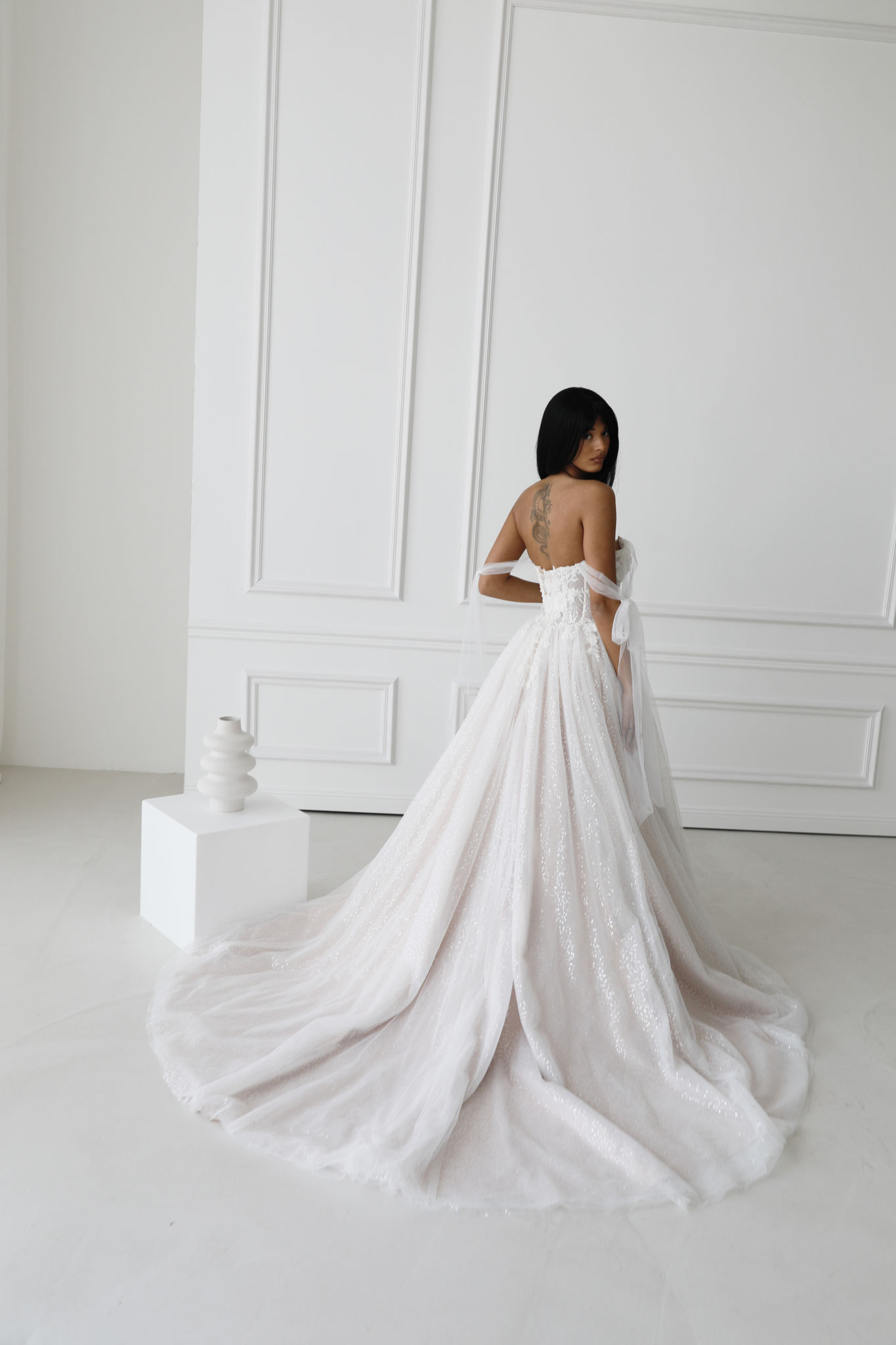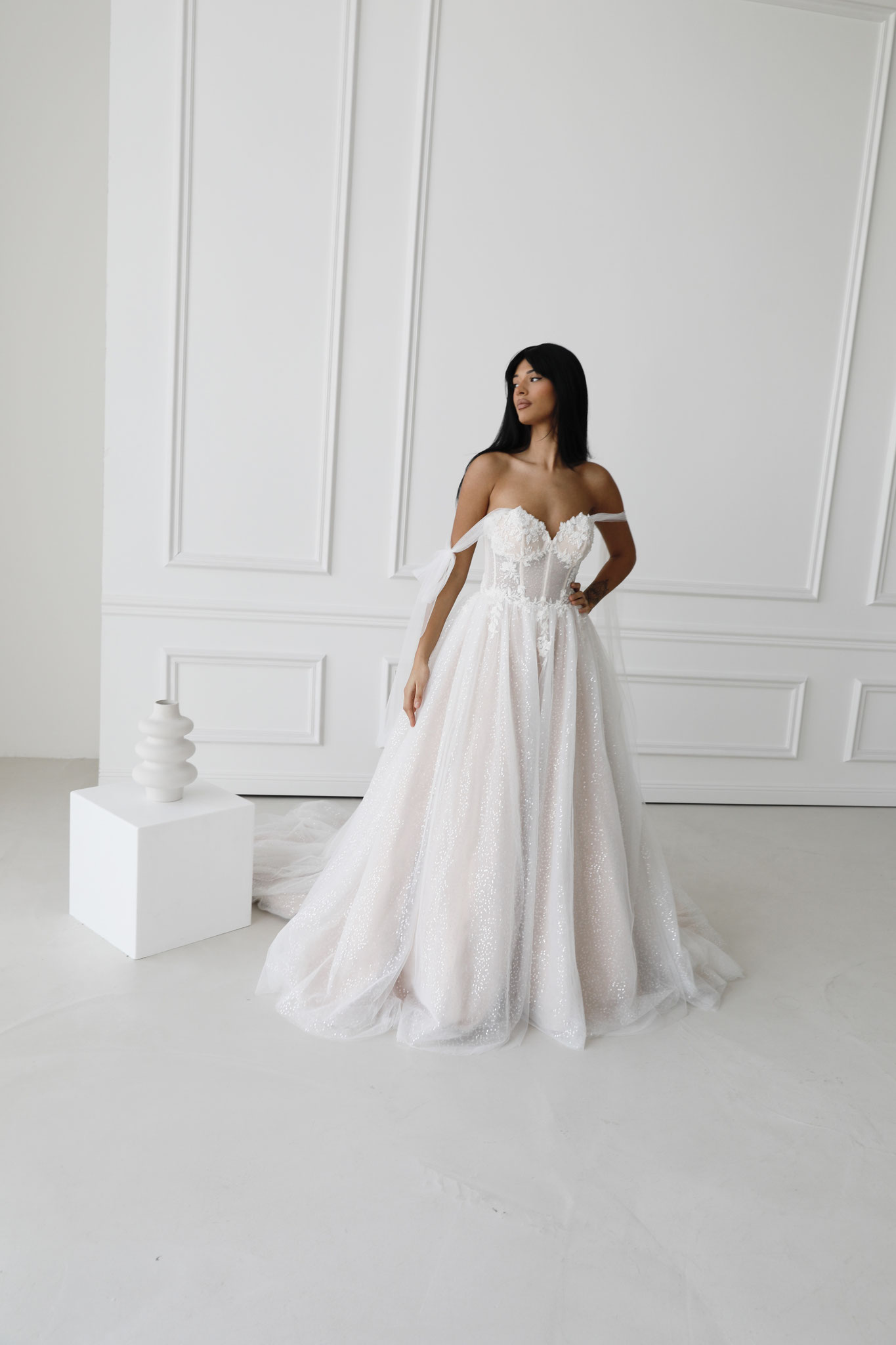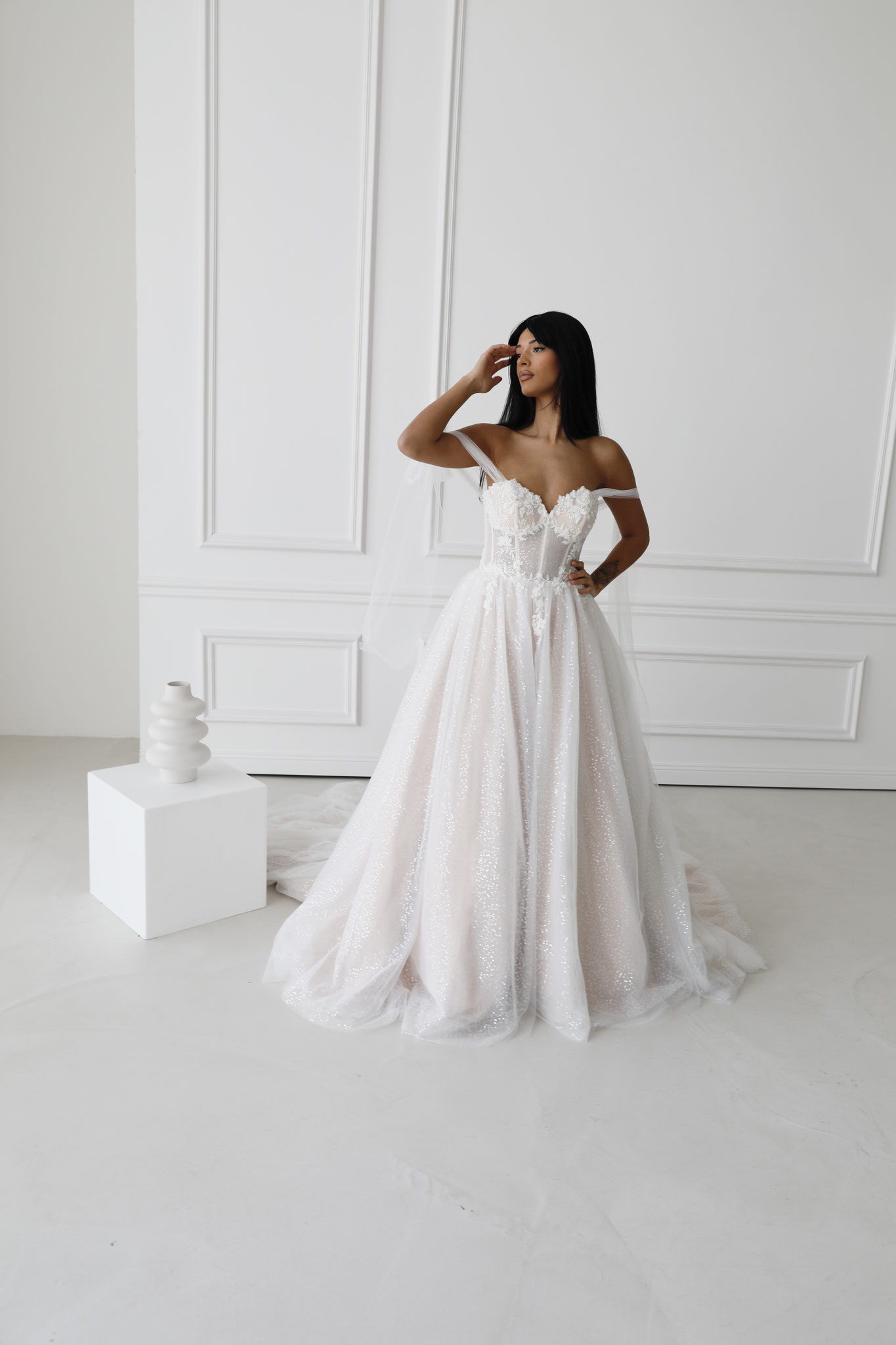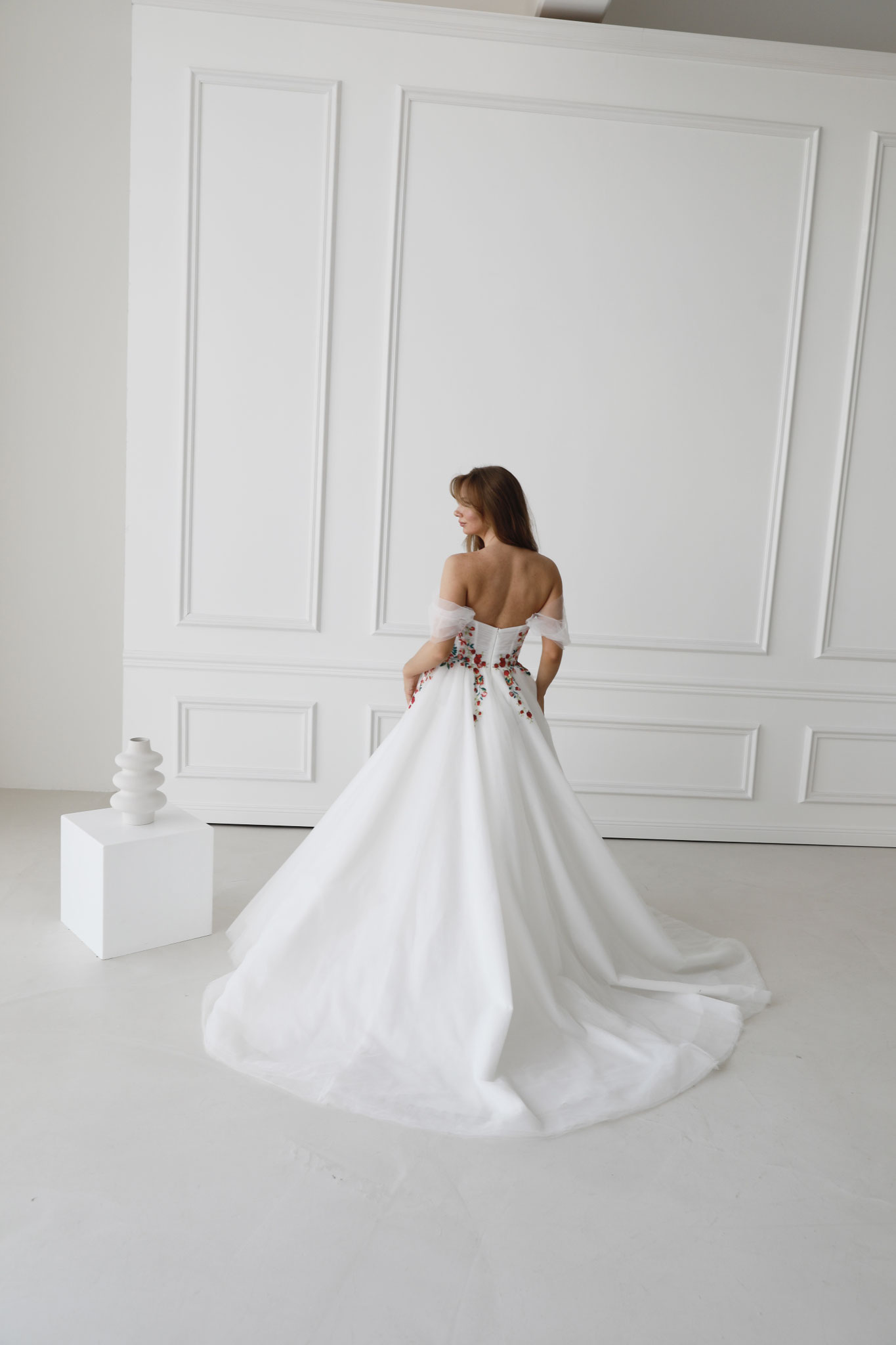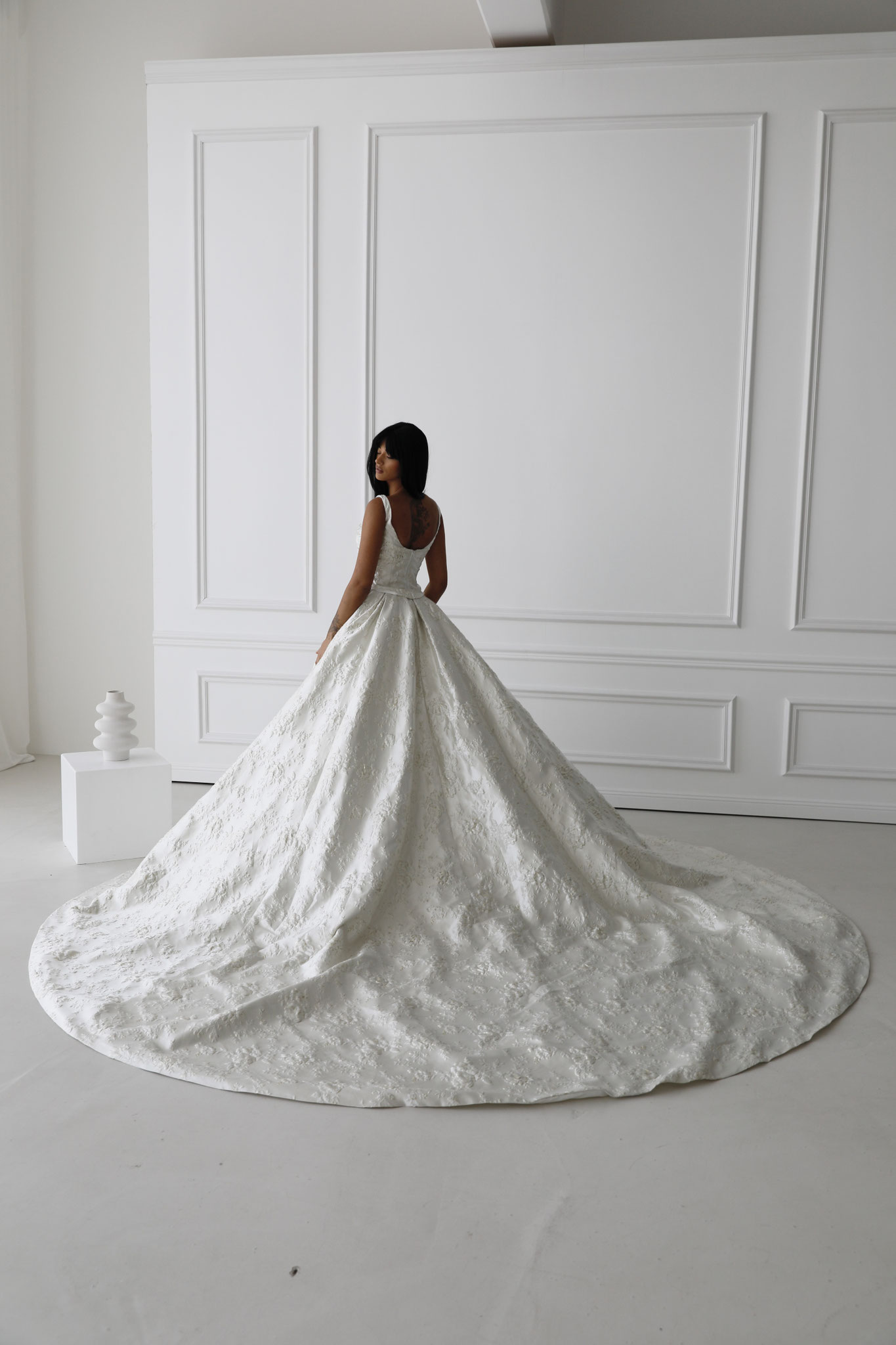 Unsere mit Blumen und floraler Spitze verzierten Brautkleider sind eine Hommage an die Schönheit der Natur. Zarte Blumenmuster und aufwendige Spitzenapplikationen verleihen jedem Kleid eine romantische Note und machen es perfekt für die Braut, die ihren besonderen Tag mit einem Hauch von Frische und Weiblichkeit feiern möchte.